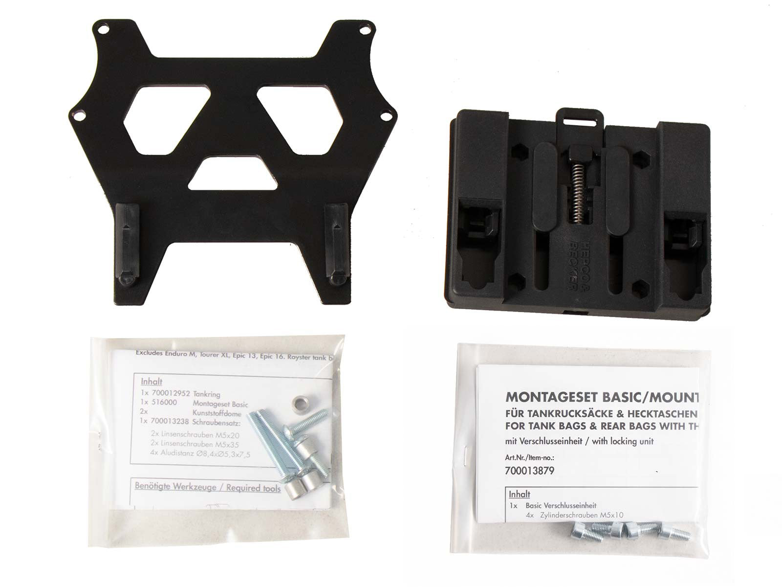 The scope of delivery includes a BASIC tank ring, as well as the fastener for tankbags, which can be individually screwed to the tank bag, depending on the shape of the tank and the angle of the handlebars.